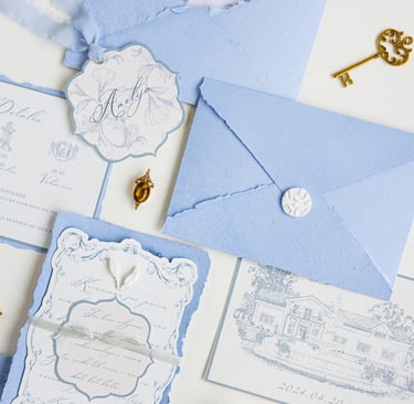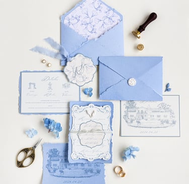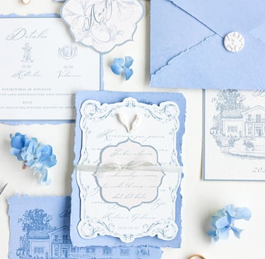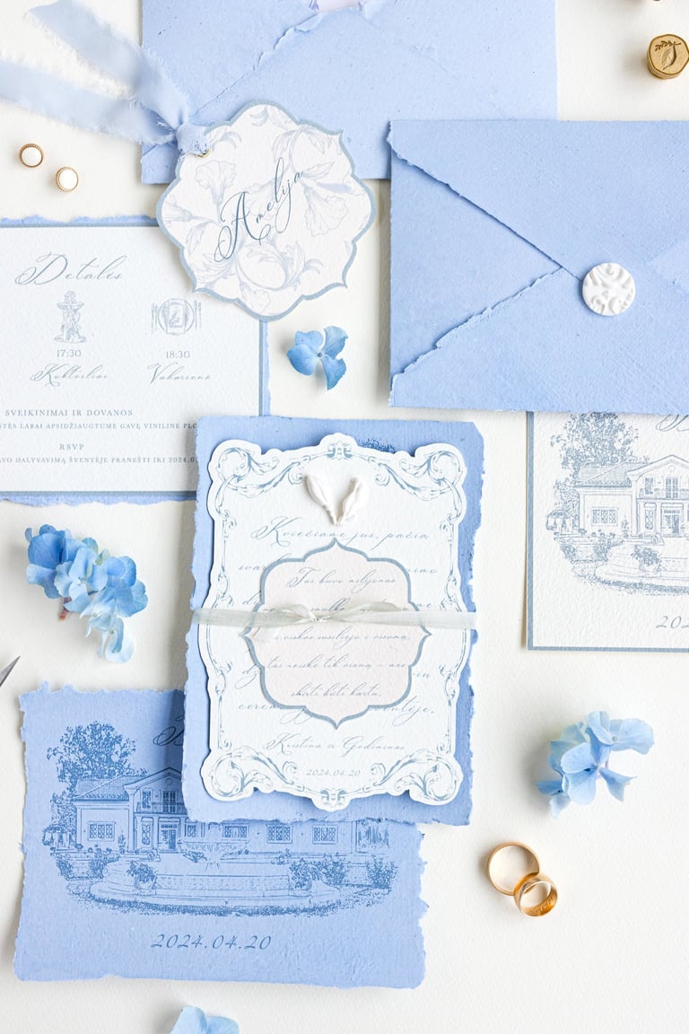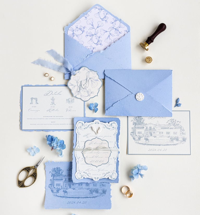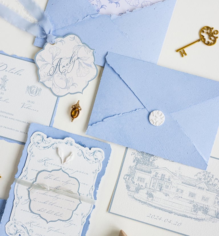 Rafinuotas, romantiškas ir dvelkiantis „French chateau“ nuotaika. Lengvi šilko ir šifono kaspinai, meilės citatos iš garsių pasaulio filmų, baroko stiliaus rėmeliai ir formos, keramikos dekoro elementai. Visą tai apjunga nuostabus rankų darbo popierius, kurio svajingai mėlyna spalva nukelia tiesiai į - ilgai ir laimingai....