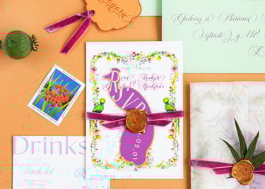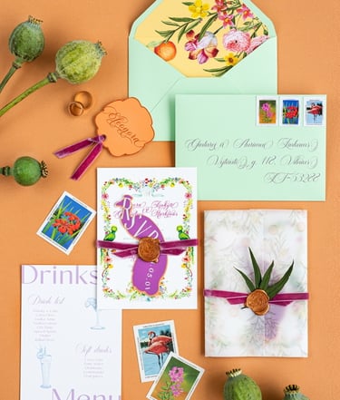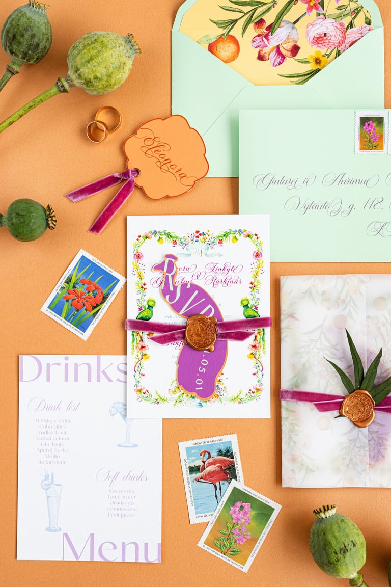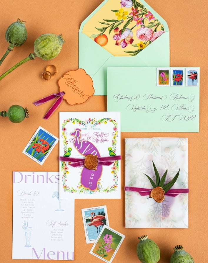 Pavasariškos spalvos mainosi su sodria madžentos nata, kurdamos įdomų kontrastą, o RSVP informacija dailiai nugulusi paties rojaus paukščio formos kortelėje, perrišta aksomo juostele užsimena apie tai, kad bus labai, net labai sodri šventės atmosfera.