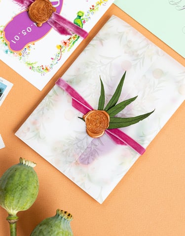 4 dalių - Vokas su vidiniu laineriu, kvietimo kortelė, RSVP kortelė, pusiau skaidraus popieriaus įvyniojimas.