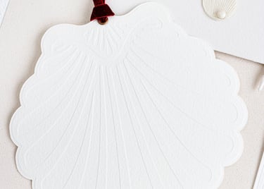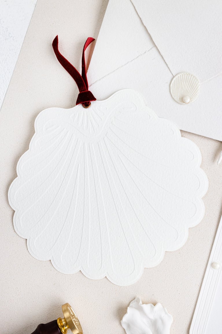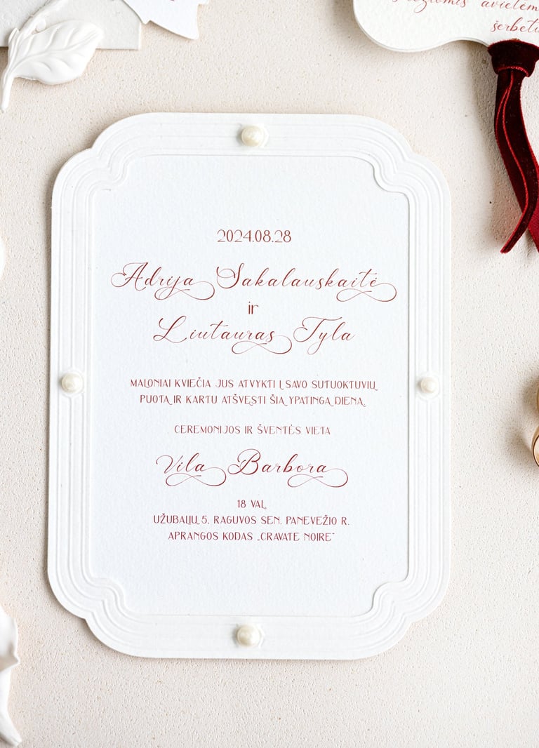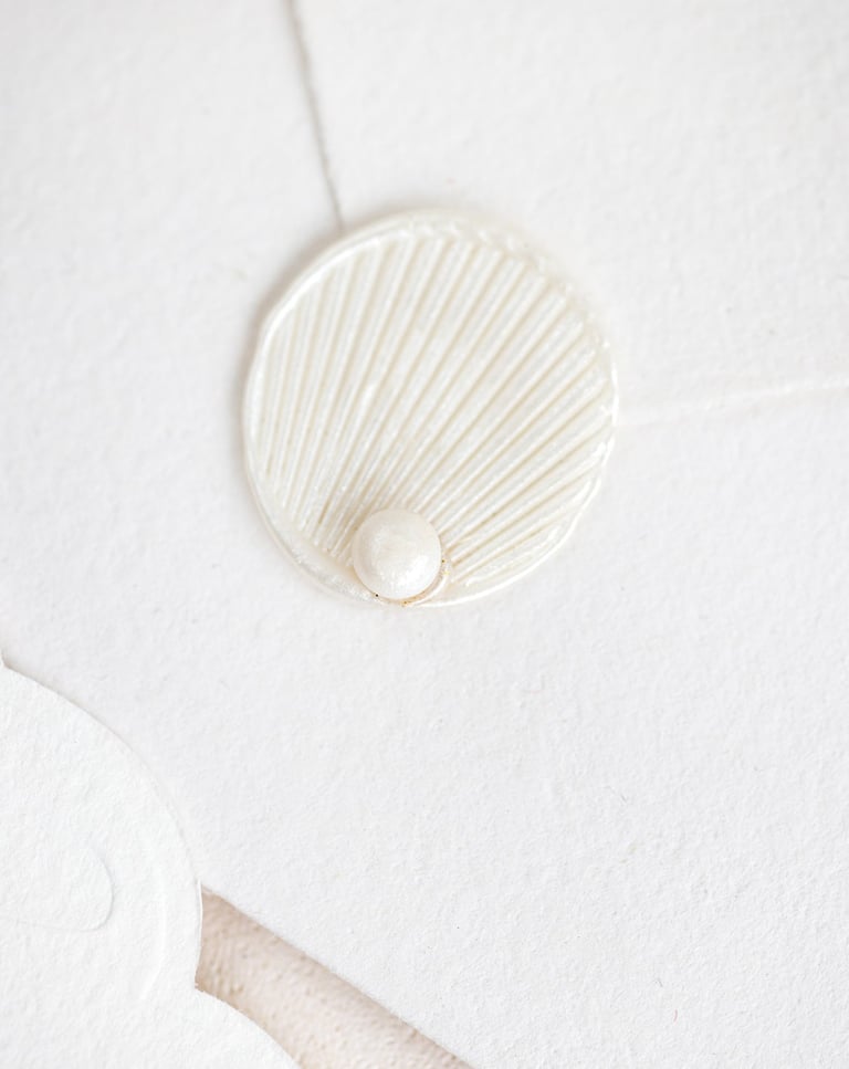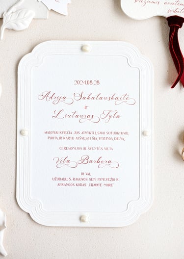 Rankų darbo popieriaus vokas, tikri perlai ir iškilioji spauda.