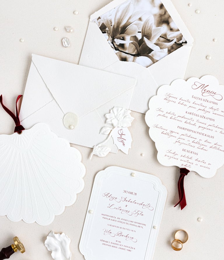 Komplektą sudaro kvietimo kortelė, dekoratyvinis vokas su vaško štampu ir vidiniu laineriu